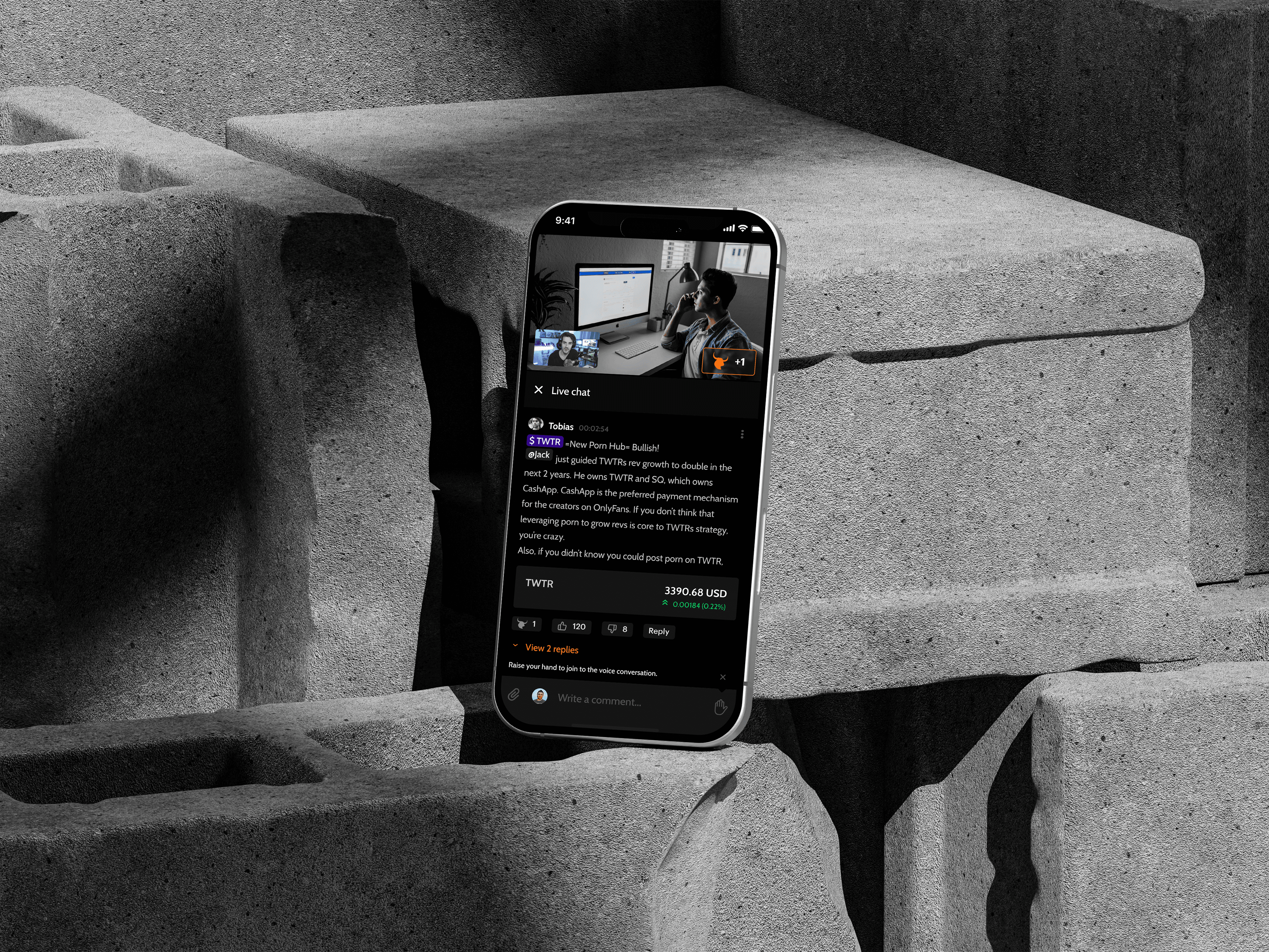 Throughout a year of iterative design and development, we built a unified web and mobile experience using a modern tech stack. The core features were crafted to make financial exploration social and immediate, allowing users to participate in conversations, join communities and access market data without friction.